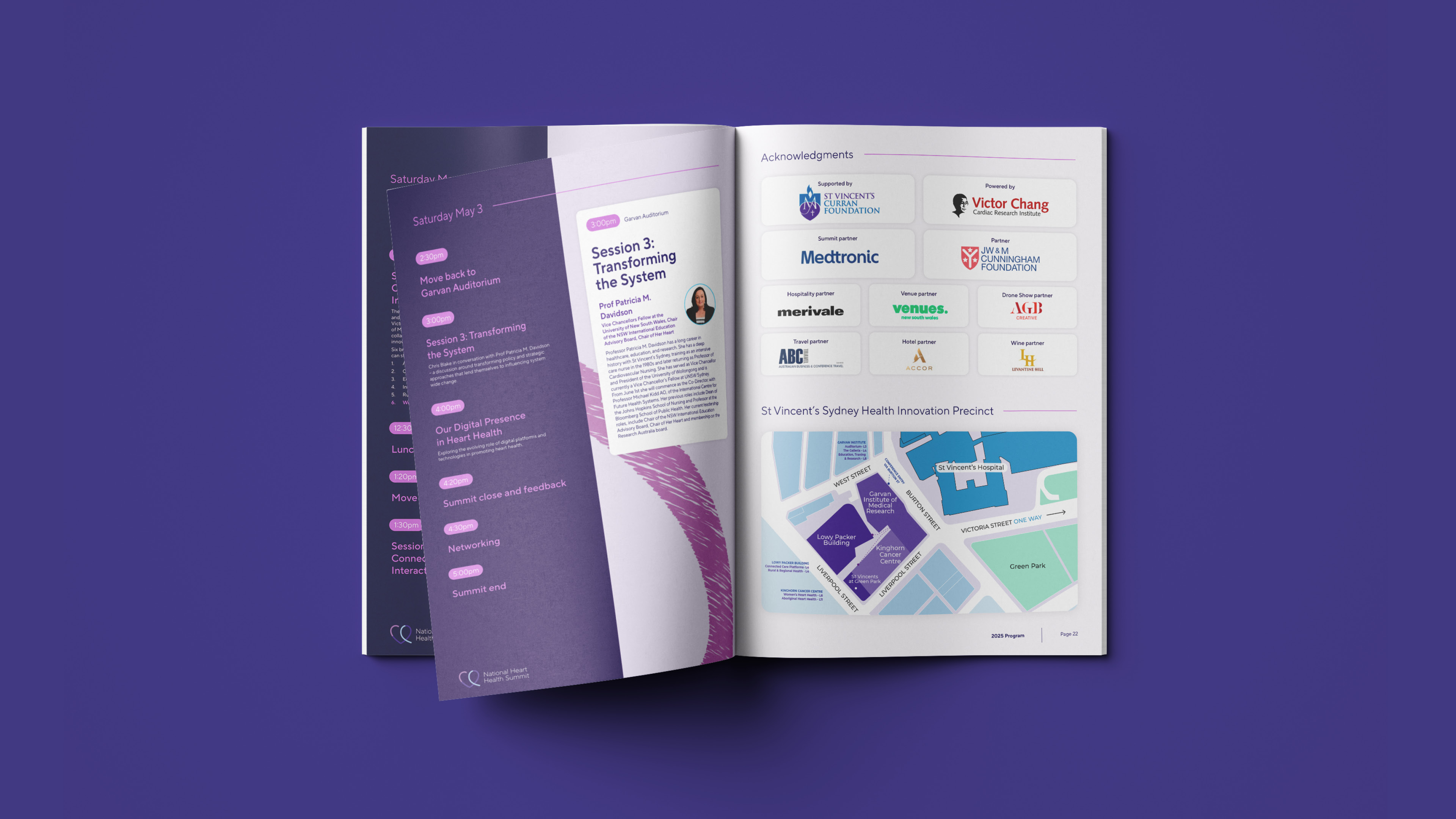 The St Vincent’s National Heart Health Summit, held in May 2025, brought together more than 250 of Australia’s leading cardiac care professionals and researchers from across the St Vincent’s network to drive innovation and address critical gaps in heart health as part of our chronic disease strategy. Lekker were invited to develop the event identity and collateral.